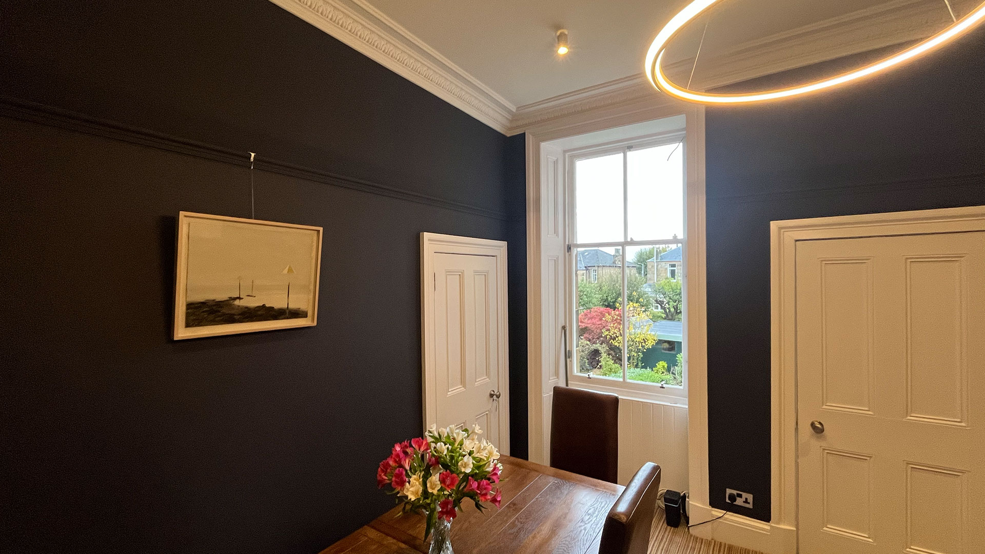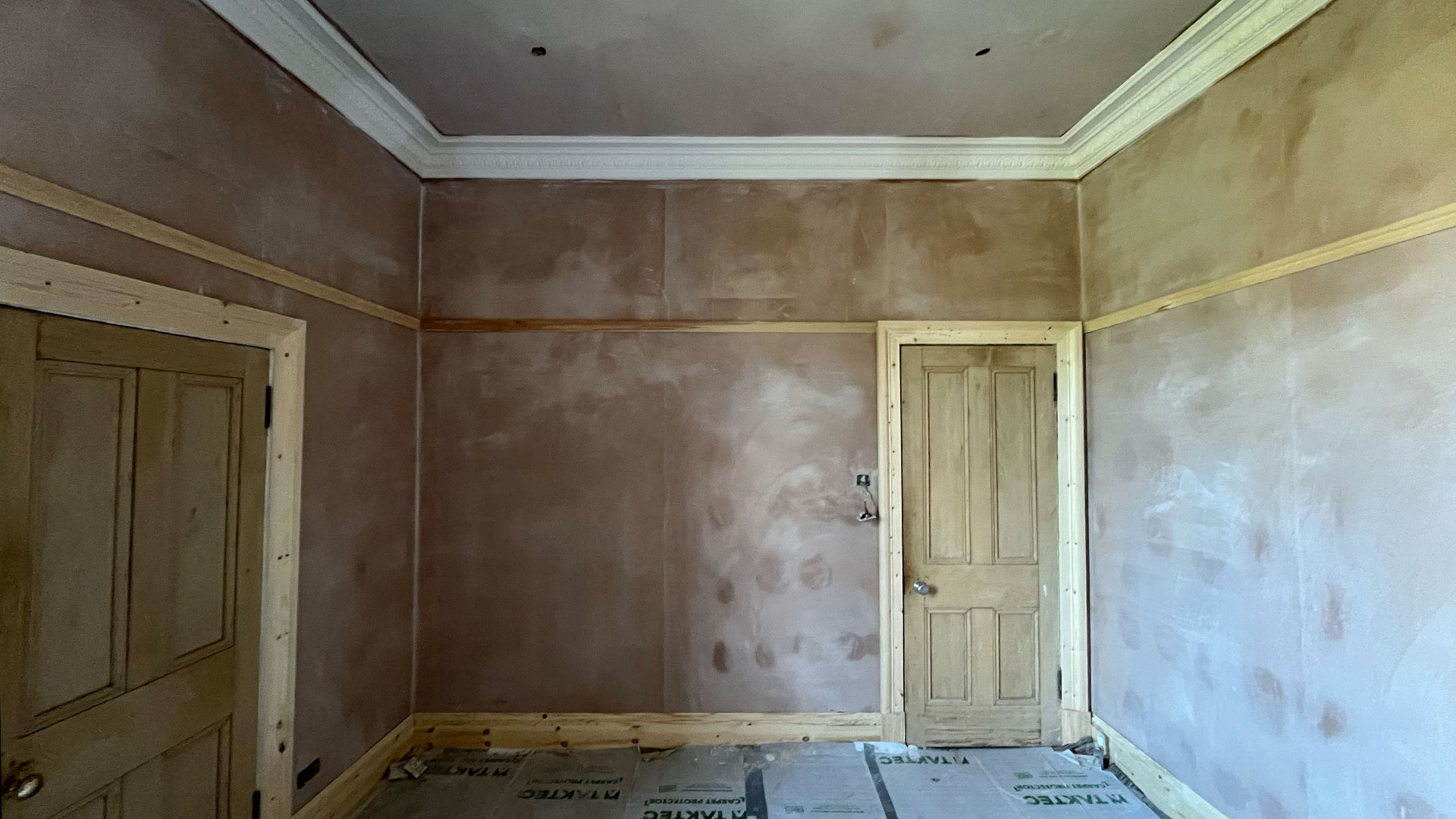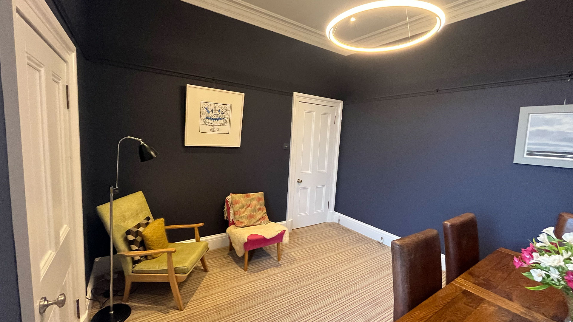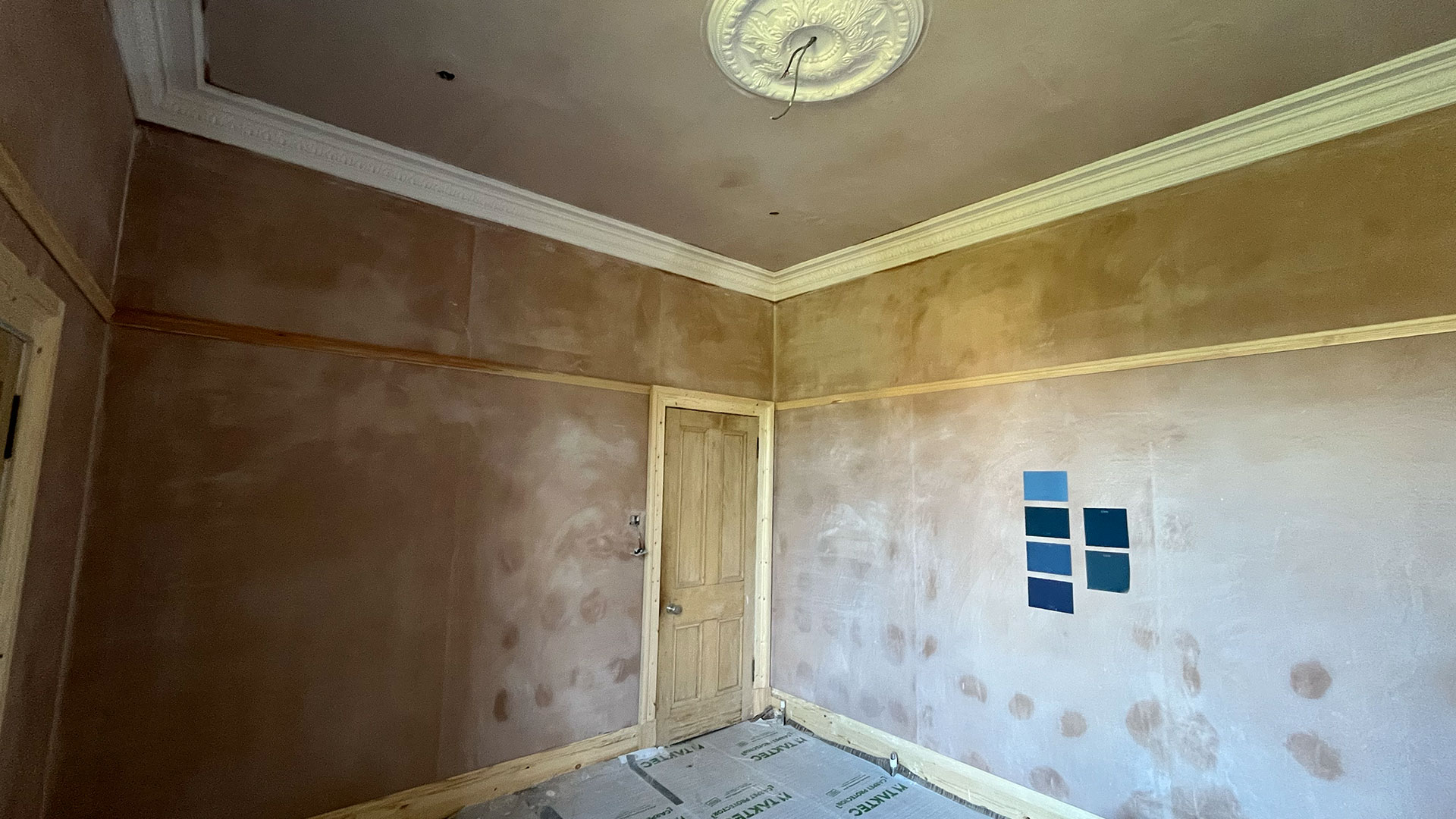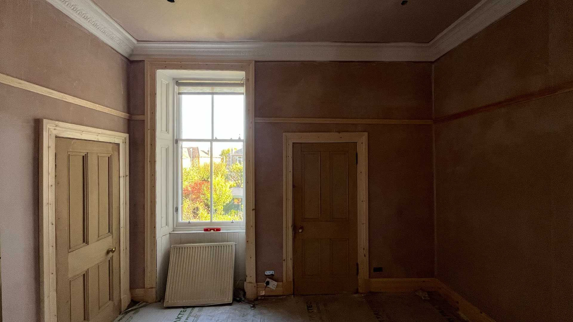For this familily home in Glasgow south side’s Giffnock area, JD Contracts stripped out the lath and plaster from the ceiling and walls, then re-sheeted ceiling and walls. Fitted new spotlights and sockets, radiatior, doors and facings. Replastered and redecorated.